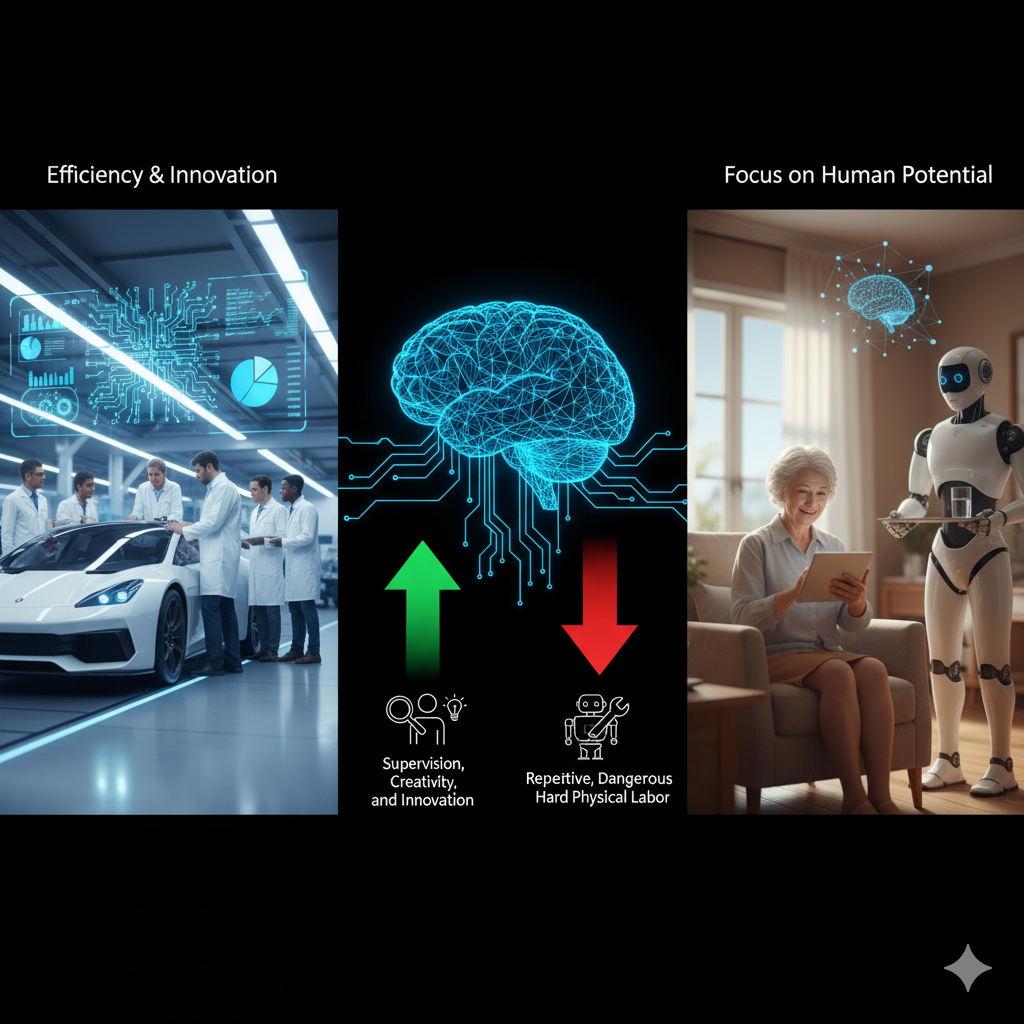Robotlar, lojistik, depolama, tehlikeli inşaat işleri, yaşlı bakımı ve hatta cerrahi asistanlık gibi birçok alanda görev alacak. Bu durum, insan iş gücünü tekrarlayan ve fiziksel olarak zorlayıcı rollerden, yaratıcılık, iletişim, karmaşık problem çözme ve YZ/Robot yönetimi gibi insana özgü yetenekler gerektiren daha yüksek değerli görevlere doğru kaydıracaktır. Bu dönüşüme uyum sağlamak için sürekli eğitim ve dijital yetkinliklerin geliştirilmesi hayati önem taşımaktadır.
