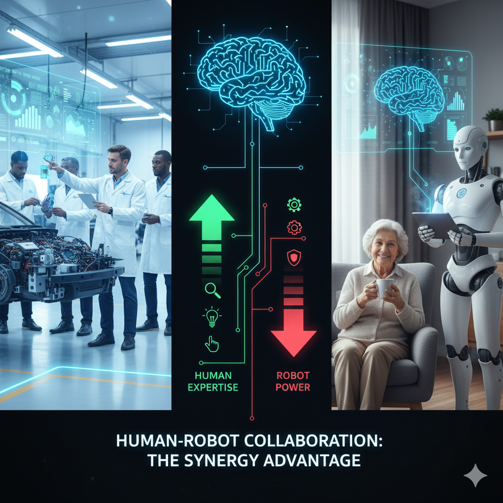 | Bilişsel Yetenek | Yaratıcılık, eleştirel düşünme, karmaşık problem çözme, duygusal zekâ. | Hız, veri işleme, tekrar hassasiyeti, 7/24 çalışma. | Akıllı ve Çevik Üretim: İnsan karar verir, robot hatasız uygular. |