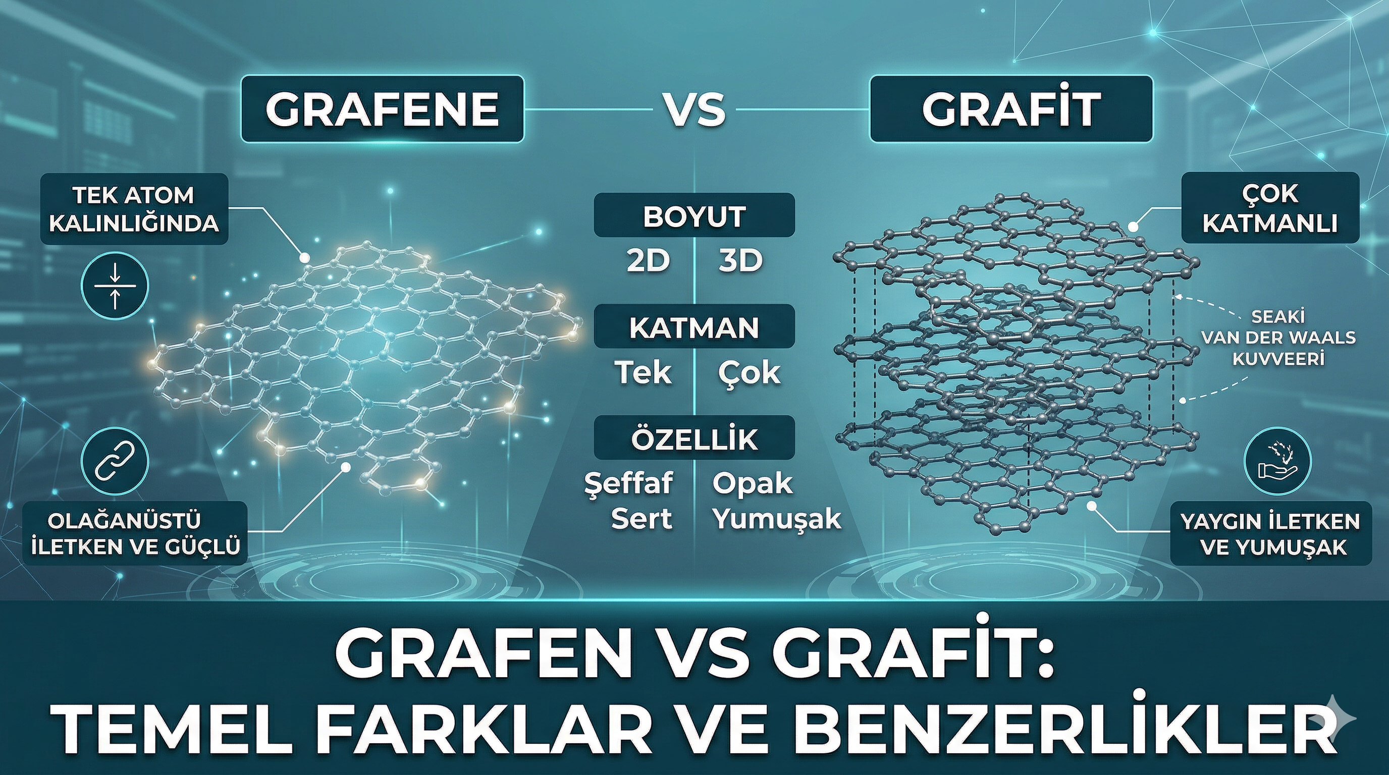 Grafen ve grafit, karbonun iki farklı ruhunu temsil eder. Biri asırlık bir dost gibi güvenilir ve mütevazı (grafit), diğeri ise sınırları zorlayan, genç ve dinamik bir dahi (grafen). Aralarındaki tek bir atomluk fark, insanlığın taş devrinden uzay çağına geçişi kadar büyük bir teknolojik sıçramayı simgeliyor. Malzeme bilimindeki bu yolculuk, karbonun her iki formunu da doğru yerde kullanarak daha sürdürülebilir bir gelecek inşa etmemizi sağlayacak.