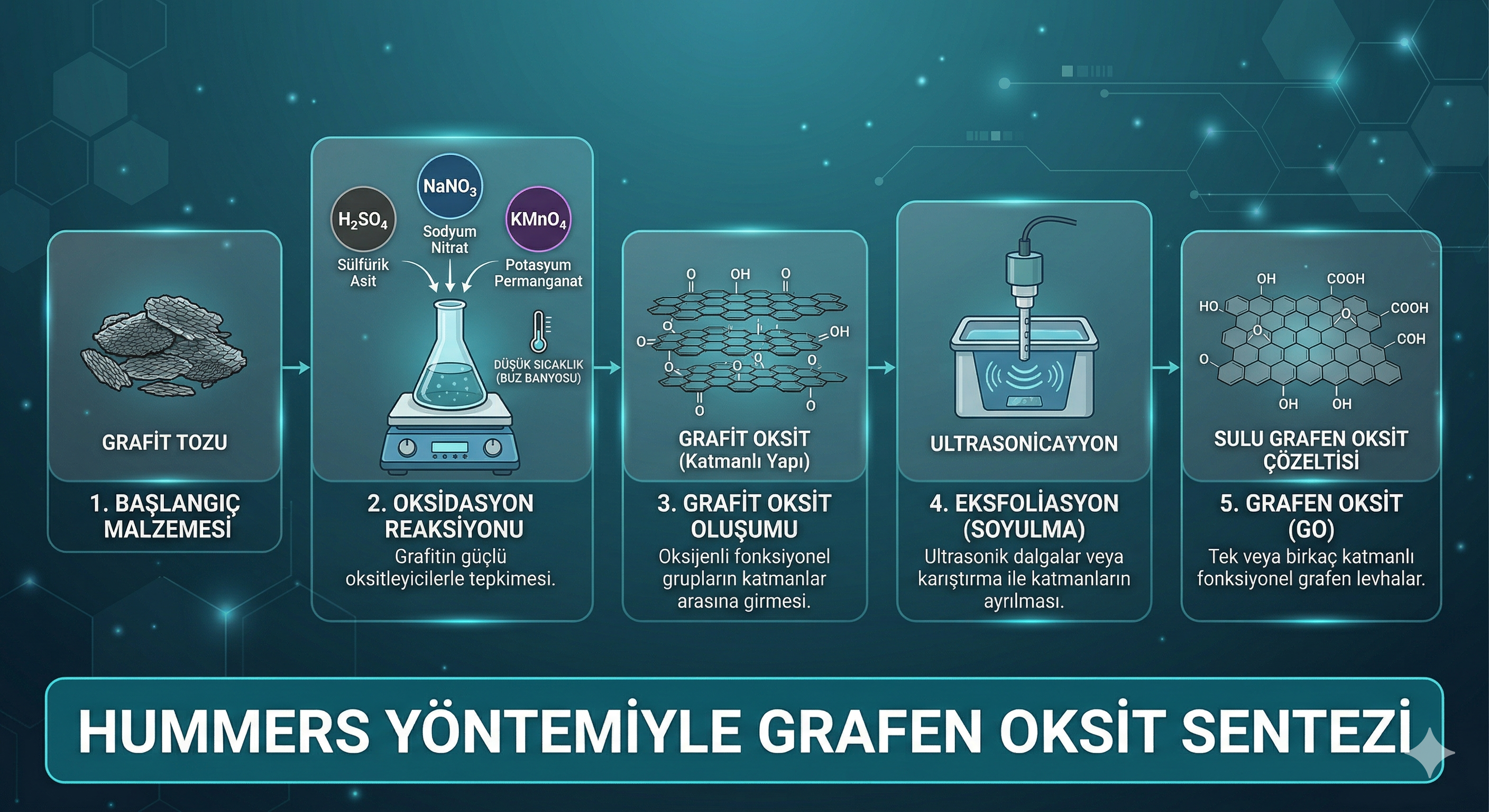 Hummers yöntemi, grafitin o cansız ve siyah yapısını, teknolojinin en esnek ve işlevsel malzemesine dönüştüren simyadır. Sülfürik asit ve potasyum permanganatın bu tehlikeli dansı, modern tıptan enerji depolamaya kadar pek çok soruna çözüm üretmektedir. Her ne kadar çevresel zorlukları olsa da, modifiye edilmiş yöntemlerle grafen oksit, 21. yüzyılın en kritik hammaddelerinden biri olmaya devam edecektir.