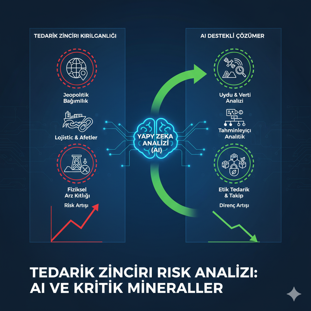 Kritik mineraller; bakır, lityum, nikel, kobalt ve nadir toprak elementleri (REE) gibi, modern teknolojinin ve yeşil enerjinin temel yapı taşlarını ifade eder. Ancak bu minerallerin tedarik zinciri; jeopolitik gerilimler, madencilik kısıtlamaları ve lojistik darboğazlar nedeniyle son derece kırılgandır. Yapay zeka, bu devasa veri yığınlarını işleyerek riskleri henüz oluşmadan tahmin eden ve “proaktif” çözümler sunan bir dijital gözetmen rolü üstleniyor.