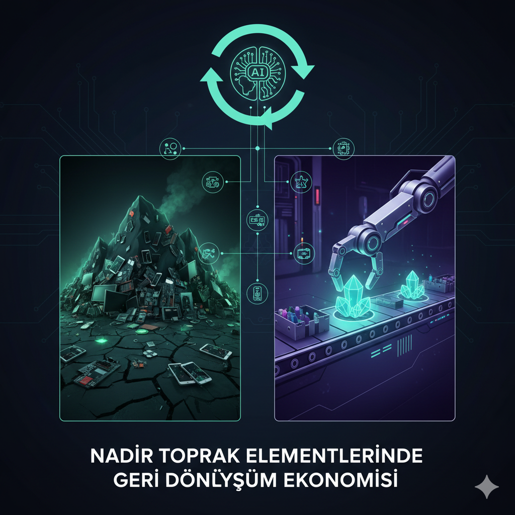 2026 yılı itibarıyla, “Kentsel Madencilik” yükselen bir trenddir. Eski sabit diskler ve çöpe giden AI sunucuları, artık birer REE kaynağıdır. Araştırmalar, AI algoritmalarının kullanıldığı otomatik geri dönüşüm tesislerinin, atık çiplerdeki nadir toprakları %95 saflıkla ayrıştırabildiğini göstermektedir. Bu, gelecekte madenlere olan bağımlılığı azaltacak en büyük çözümdür.