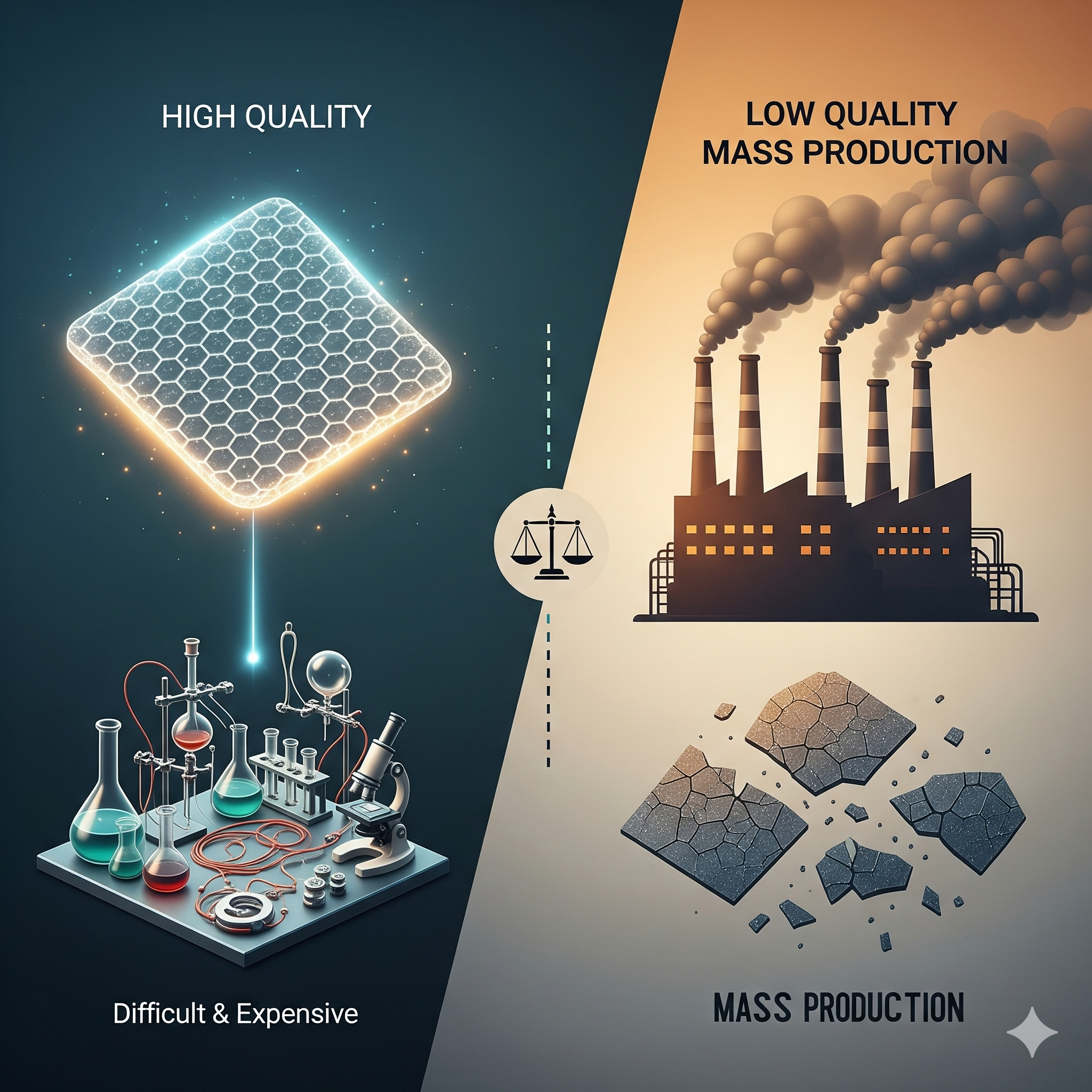 2. Ölçeklenebilirlik (Scalability): Laboratuvarda santimetrekare boyutunda mükemmel bir grafen filmi üretmek ile bir fabrikada binlerce metrekare üretmek arasında devasa bir fark vardır. Üretim sürecini büyütürken kaliteyi korumak, maliyetleri kontrol altında tutmak ve süreci otomatikleştirmek karmaşık mühendislik problemleri içerir.