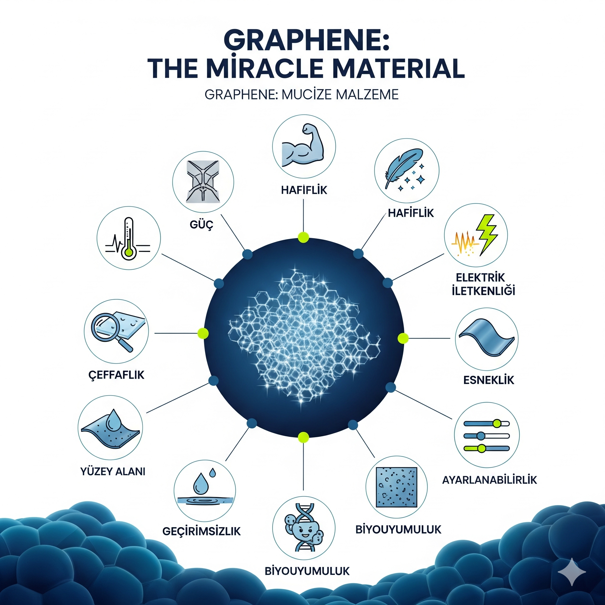 Grafen, karbon atomlarının altıgen bir bal peteği örgüsü şeklinde dizilmesiyle oluşan iki boyutlu bir malzemedir. Bu inanılmaz derecede ince yapı, ona olağanüstü özellikler kazandırır. Çelikten 200 kat daha güçlü olmasına rağmen son derece hafif ve esnek olan grafen, aynı zamanda bilinen en iyi elektrik ve ısı iletkenlerinden biridir.