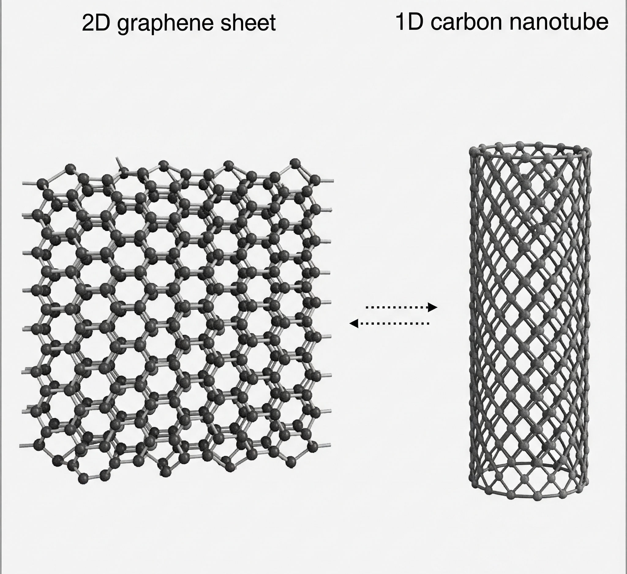 | Yapı | 2D Düzlemsel | 1D Silindirik | Grafen bir yüzey, CNT ise bir elyaf/tel karakterindedir. |