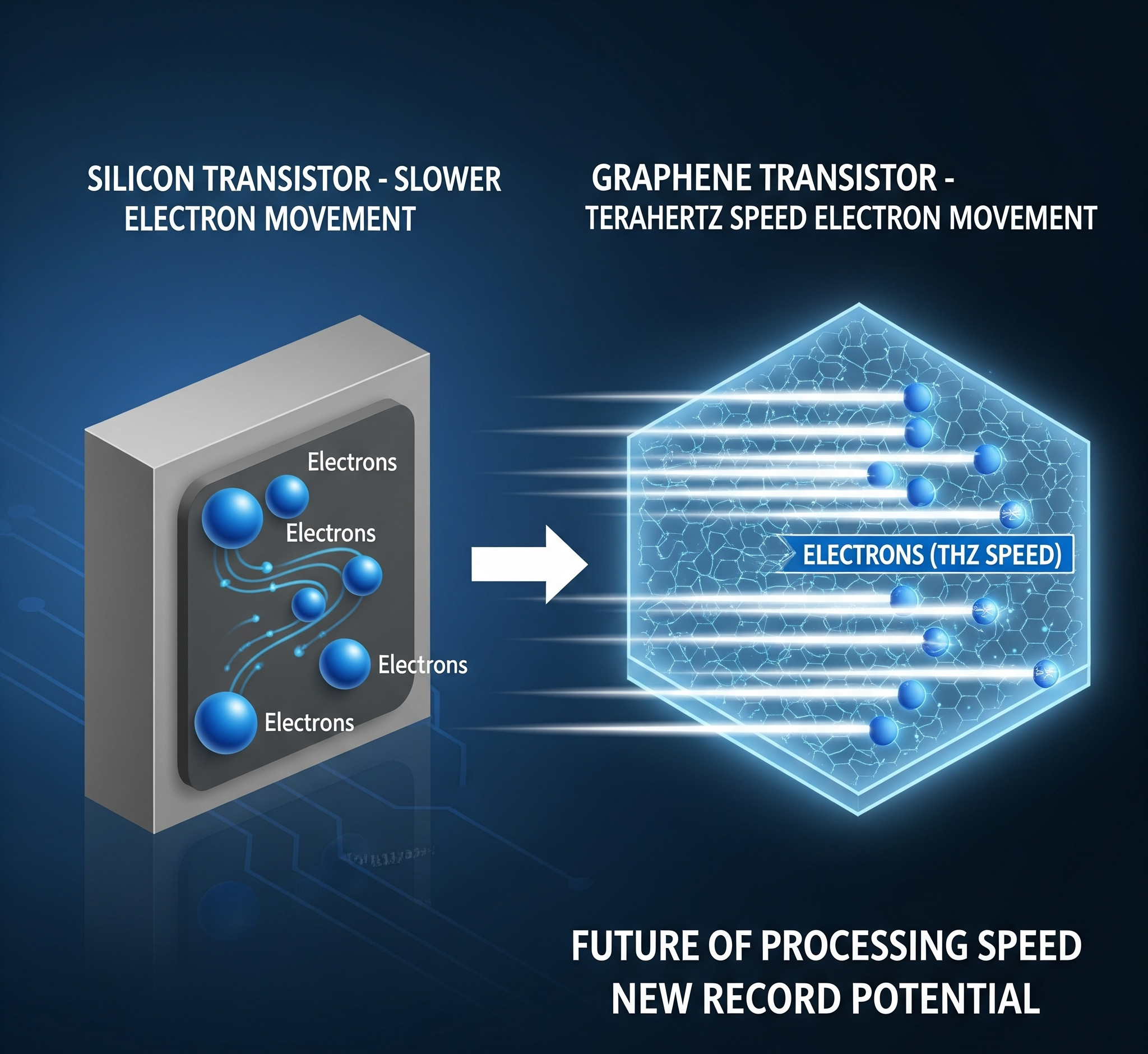 Grafenin kusursuz, iki boyutlu karbon yapısında, elektronlar neredeyse hiç bir engelle karşılaşmadan, kütlesiz parçacıklar gibi davranarak hareket ederler. Bu, grafenin elektron mobilitesinin silikondan yüzlerce kat daha yüksek olduğu anlamına gelir. Bu olağanüstü özellik, teorik olarak transistörlerin çok daha hızlı “açılıp kapanmasını” sağlar. Günümüz işlemcileri Gigahertz (GHz) hızlarında çalışırken, grafen tabanlı transistörler Terahertz (THz) hızlarına ulaşma potansiyeli taşır. Bu, saniyede trilyonlarca işlem demektir ve günümüzün en hızlı bilgisayarlarından bile 100 ila 1000 kat daha hızlı olmak anlamına gelir.