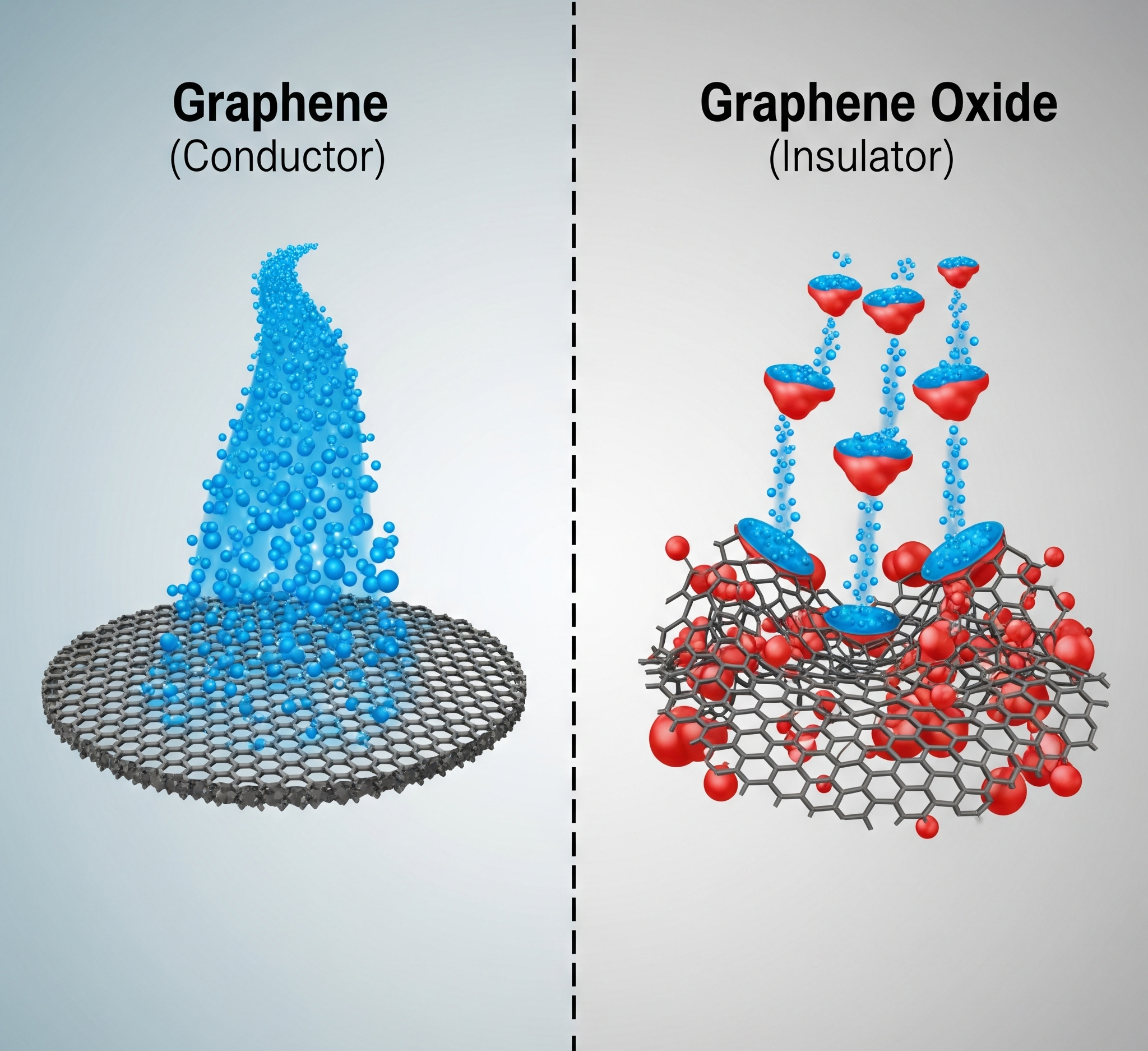 Sonuç olarak, grafen oksit tabakası, iletken sp² bölgelerinin ve yalıtkan sp³ bölgelerinin bir karışımı haline gelir. Oksijen grupları, o mükemmel “elektron otoyolu” üzerinde devasa “barikatlar” veya “çukurlar” oluşturur. Elektronlar artık tabaka boyunca serbestçe akamazlar; bu yalıtkan sp³ adacıklarına takılıp kalırlar. Bu nedenle, grafen oksit bir bütün olarak elektriksel yalıtkan gibi davranır.