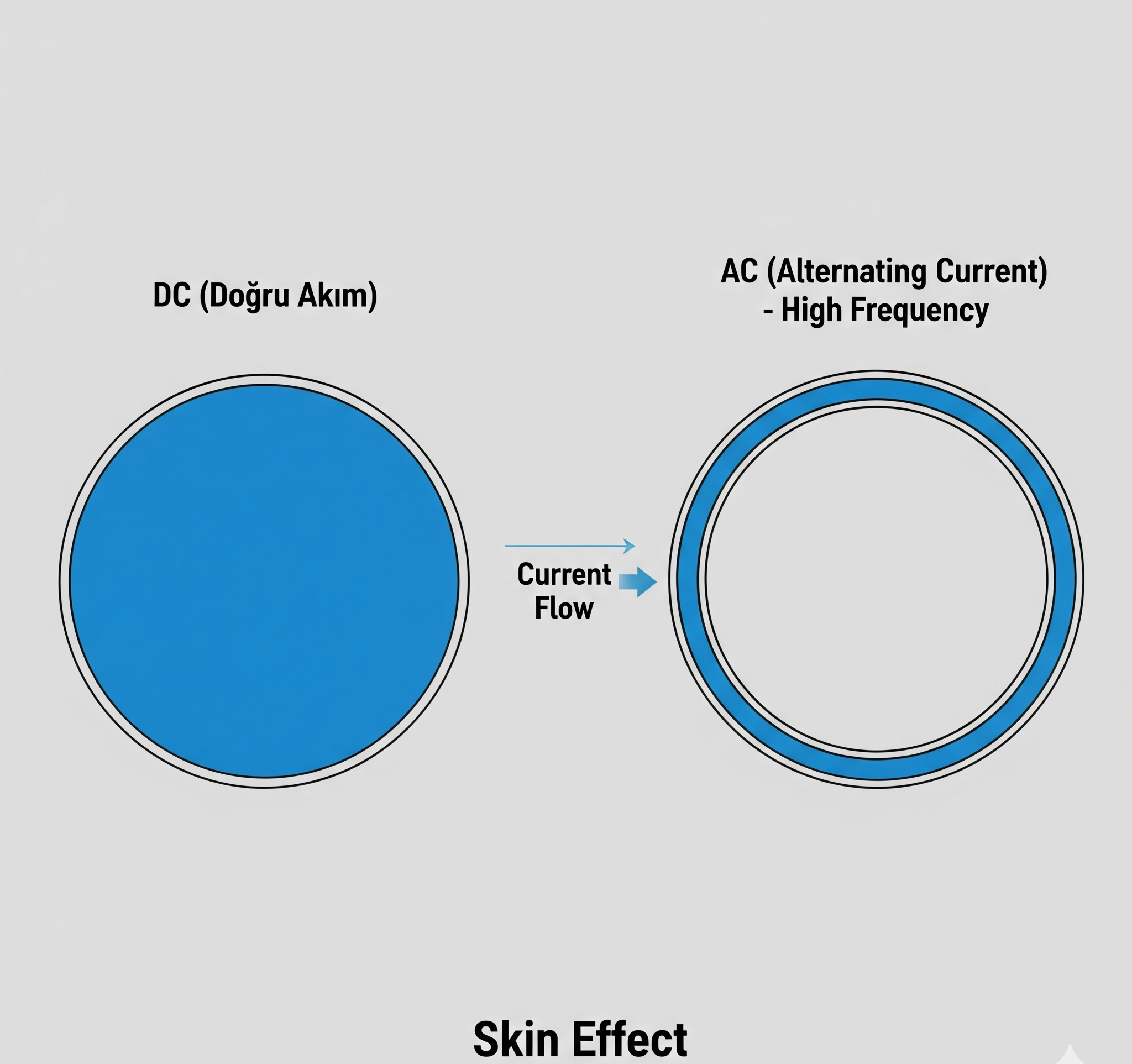 | Akımın Dağılımı | İletkenin tüm kesitine homojen yayılır | Yüzey Etkisi (Skin Effect) nedeniyle yüzeyde toplanır |