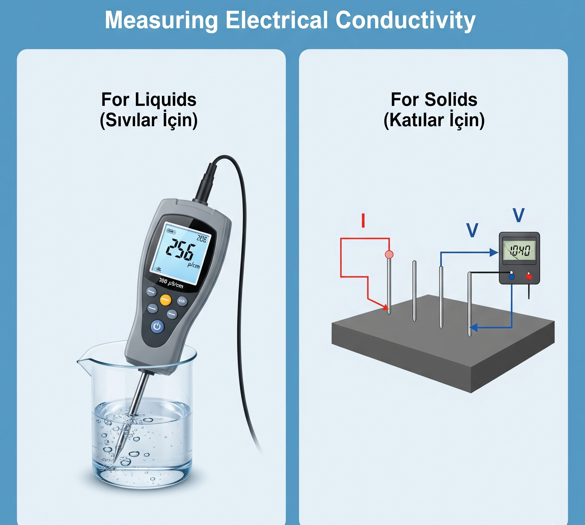 - Nasıl Çalışır? Cihazın probunda, aralarında belirli bir mesafe olan iki veya dört elektrot bulunur. Prob sıvıya daldırıldığında, elektrotlara bilinen bir voltaj (genellikle AC) uygulanır. Cihaz, elektrotlar arasında akan akımı ölçer. Ohm Yasası’nı kullanarak önce direnci/kondüktansı, ardından elektrotların geometrisini hesaba katarak kondüktiviteyi (iletkenliği) hesaplar ve ekranda μS/cm gibi birimlerle gösterir.
