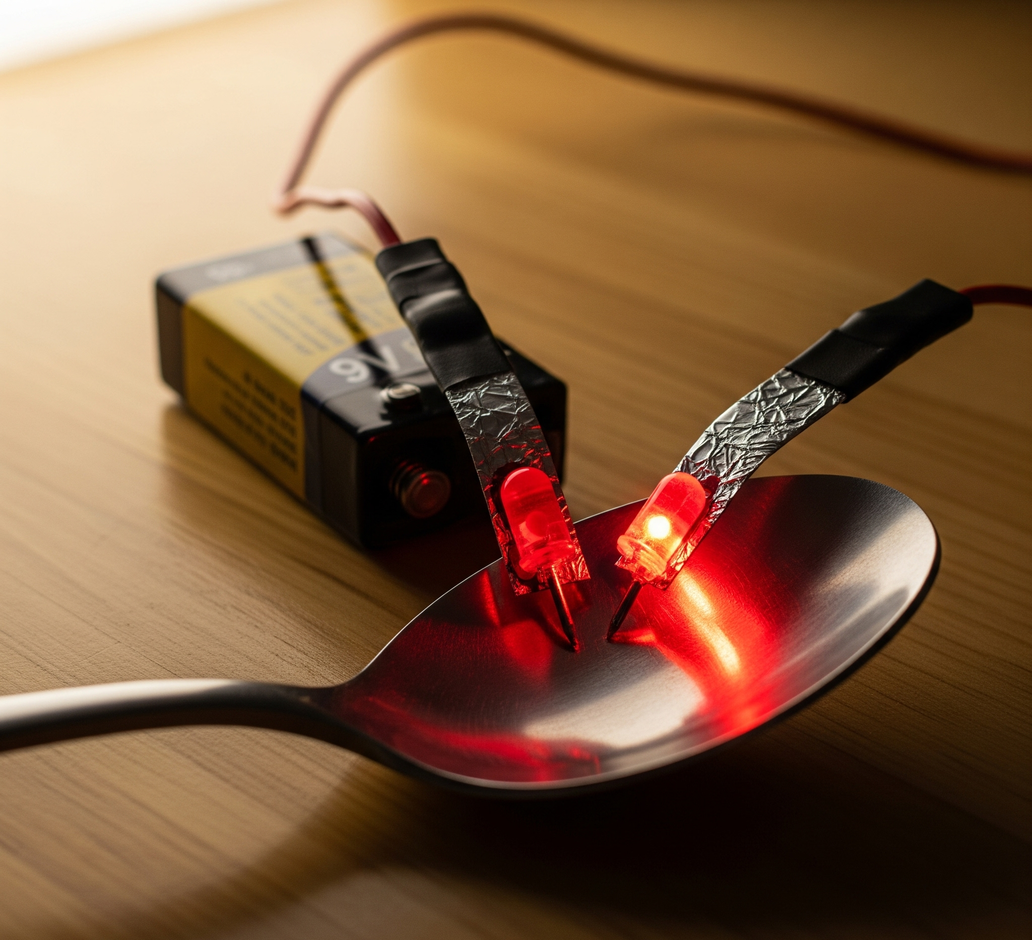 • LED Parlak Yanıyorsa: Bu, malzemenin elektriği çok iyi geçirdiğini gösterir. O bir iletkendir! (Örn: Metal kaşık, madeni para, kurşun kalem ucu). Akım, pilinizden çıkıp folyo, LED ve test ettiğiniz malzeme üzerinden geçerek devreyi tamamladı.